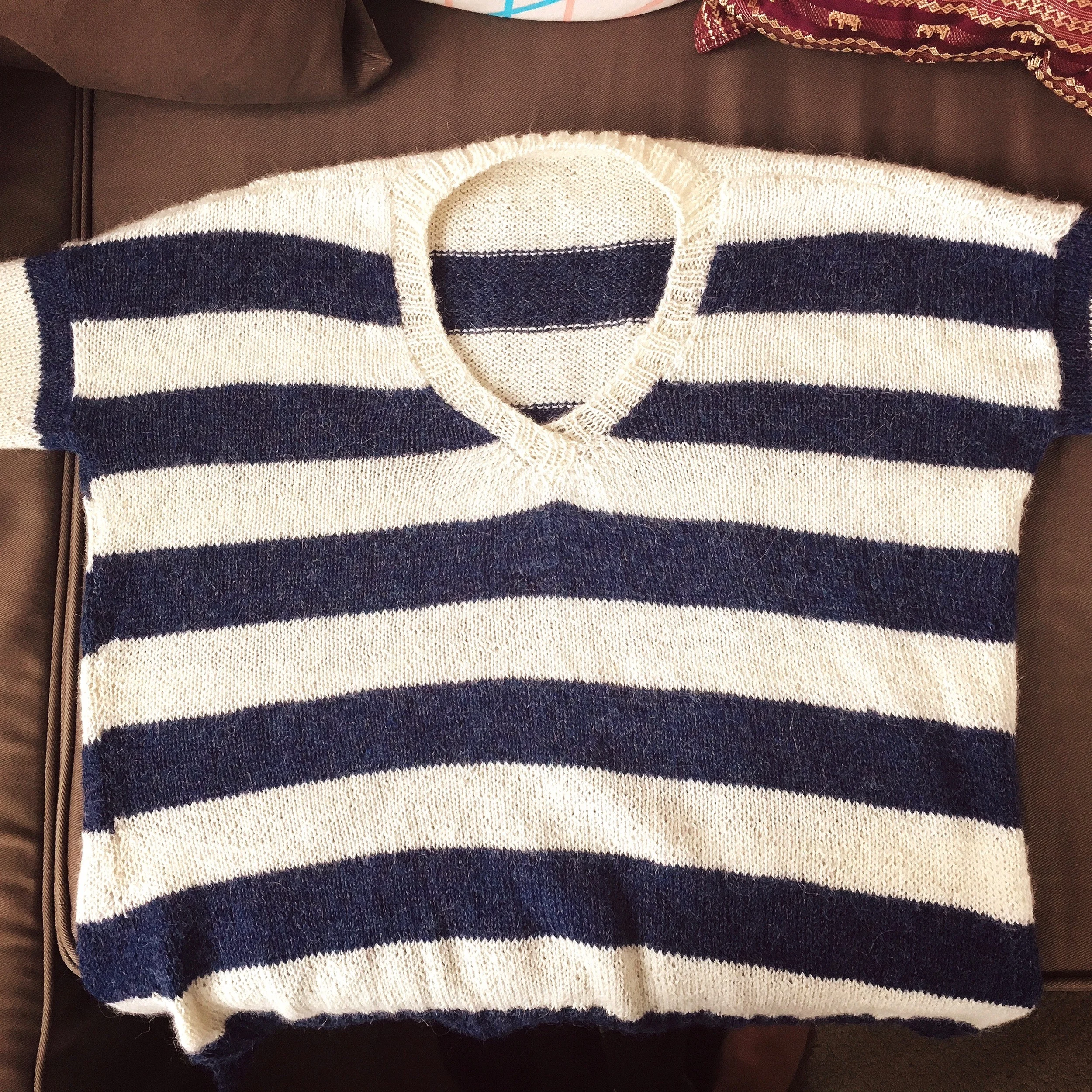 This project started off great! gauge swatch matched up perfectly using the suggested needle sizes (I typically have to go up a size) and knitting hummed along smoothly....I even knit the sleeves two at a time #likeaboss. Then I ran into my first bit of bad luck.....while weaving in the thread tails from the different stripes (and watching tv at the same time, tisk!) I cut into the body and made a hole! Panic ensued followed by my commonsense saying "keep calm and consult the googles". A few minutes of frantic googling and about an hour of work later I had a fix that involved weaving in some new yarn....it didn't look very pretty at the time but after blocking you can only really see it if you look for it :D (the fix was so good that I completely forgot to take a picture of it) crisis averted! Once I got to seaming things took a turn for the worse again.....I couldn't get one of the stripes to line up nicely when I seaming the body and eventually had to just leave it since it was only off by one stitch on one side.....then I used the wrong colour as well as starting on the wrong side when picking up to knit the neckband and had to rip about three rows out and start again....then when I was finishing the neckband I forgot I was doing a tubular cast off cut the yarn so I had to re-attach it to finish the cast off.....AND THEN, while I was seaming the sleeves in, I put one sleeve in upside down! Which wouldn't have been a problem except it was the one sleeve where I had forgotten to do the extra step for 'jogless stripes in the round' on two of the stripes......I knew it was going to bug me being able to see my mistake on my arm every time I wore the sweater so I went in and ripped out the sleeve seaming....except I didn't.....I followed the wrong thread tail and since I was so intent on just ripping out the seam and getting it done I didn't notice that I had undone the side seaming instead..........I was really living my best life that day.......