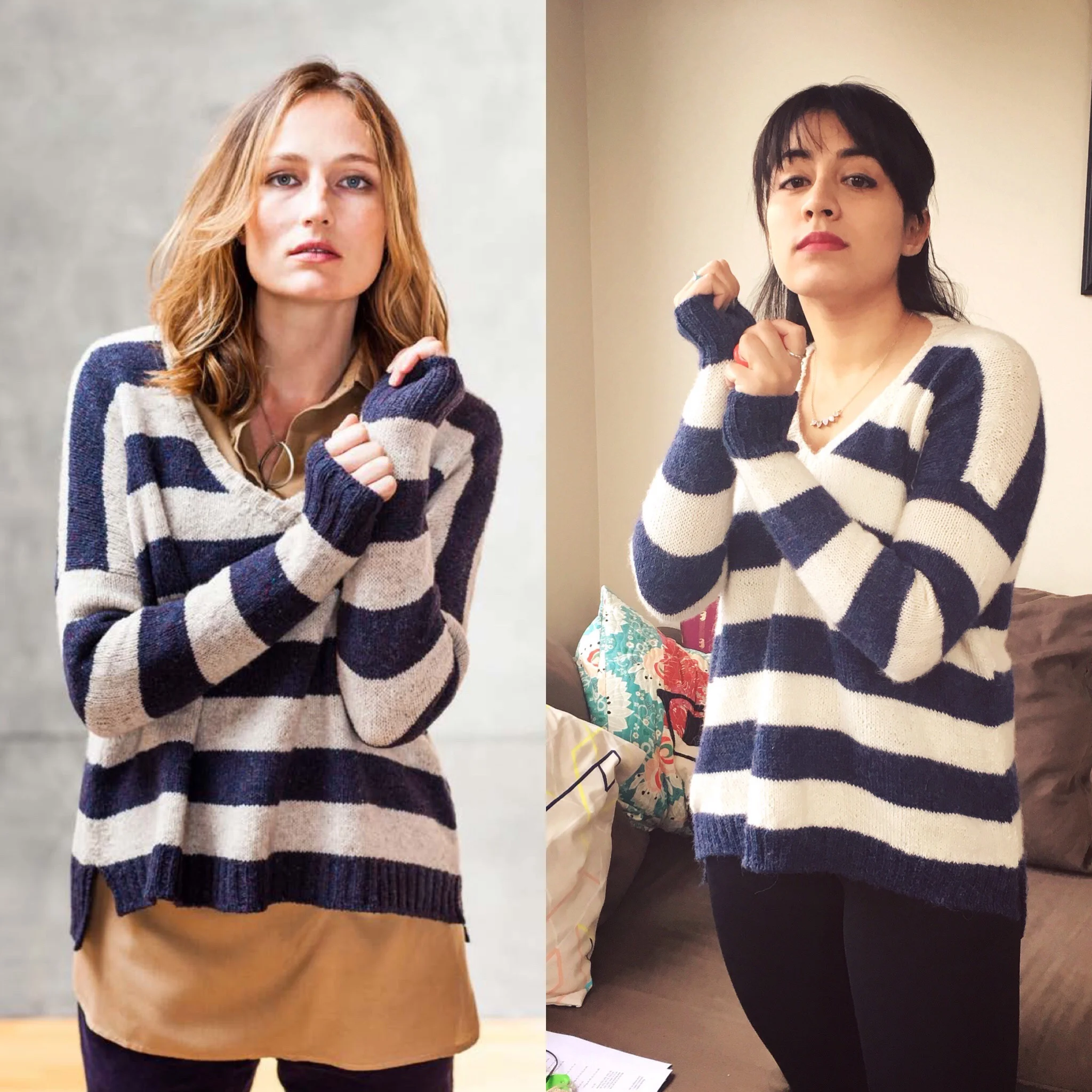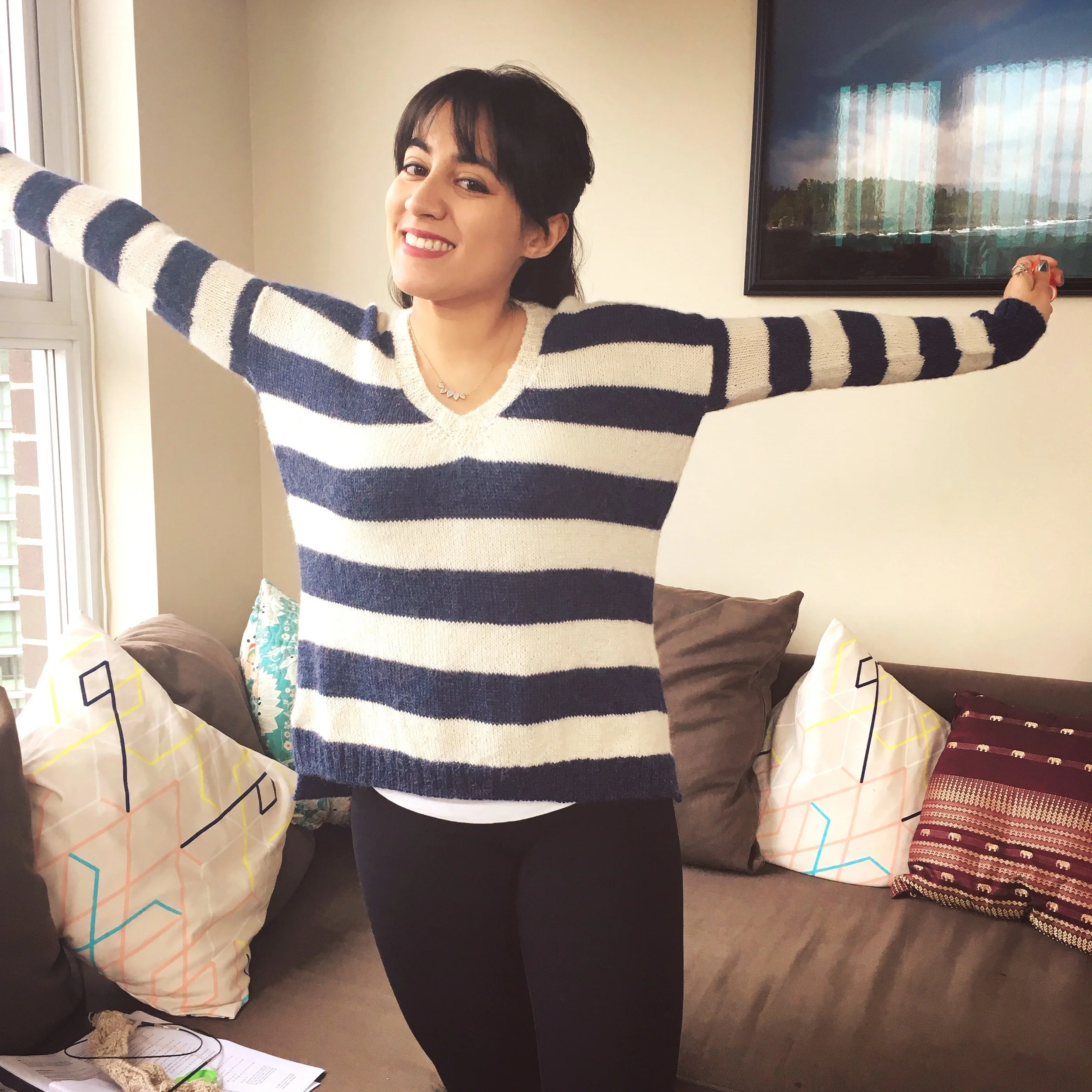 The problems were certainly worth it though because the finished product is so comfy! I can see myself wearing this sweater a lot! I'm really glad that I made the decision to go down a size because the length in both the body and arms fit great, and the v-neck isn't too deep. This knit looked HUGE when it was done so I was really worried that it would just be too massive on me but it all worked out! #KnittingKarma