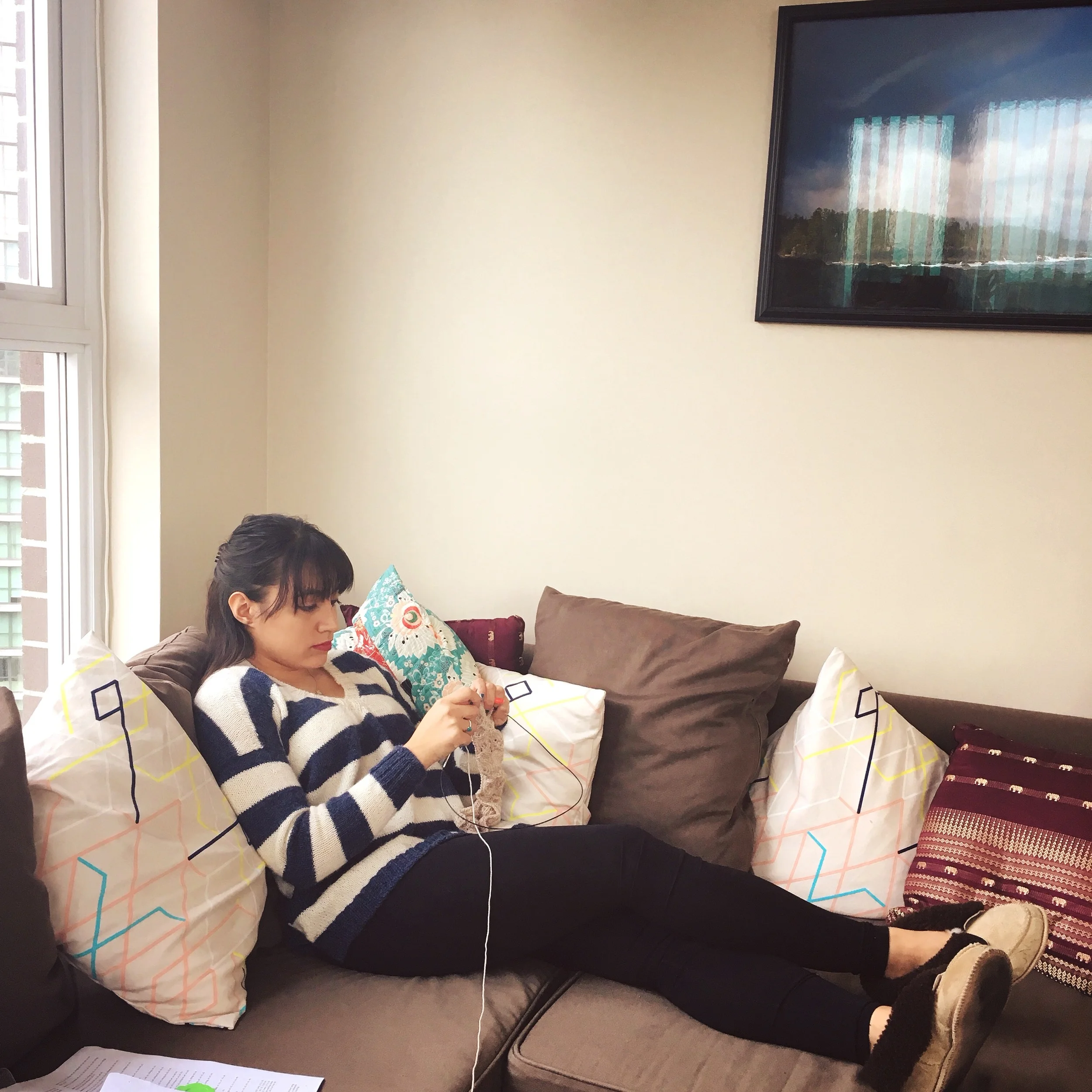 David Attenborough: Here we have a knitter in it's natural habitat....it's built a nest in the corrner of a couch with plenty of pillows....notice that they are wearing comfy slippers and a piece of knit ware it previously made....given the intricate lace it is knitting we do not need to worry about noises disturbing it....only the sound of tea being made could distract it now