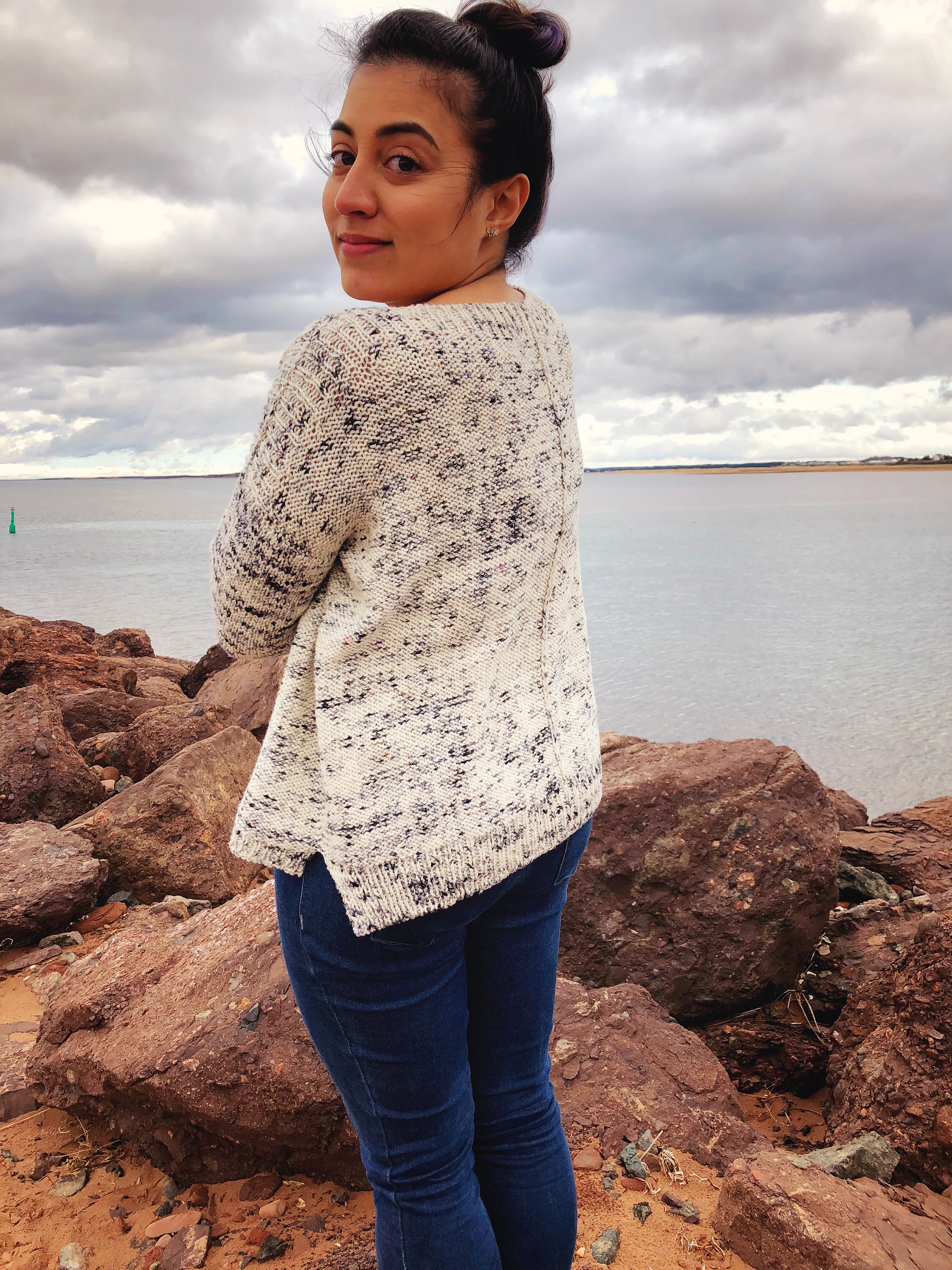 I knit this sweater from a frogged project I started back in 2017, originally this yarn was destined to be a Shoji cardigan but about 1/2 through knitting that project I realized that I didn’t really want another cardigan and I didn’t really want a speckle-ly cardigan anymore. (Also, while the Shoji cardigan is a really interesting looking sweater, knitting is quite boring as you have to knit what amounts to a huge and heavy scarf first before all the interesting construction bits). What I really wanted was a comfy, ‘throw on and don’t have to think about it speckle-ly sweater’. Enter the weekender pattern! I knew when I spied this pattern that I would have to make a speckle-ly version of it. It’s just the kind of sweater that I needed in my wardrobe at the time. Something that I could just throw on with a pair of jeans (as seen here in my favorite pair of midrise ginger jeans!) and just be comfy. While the pattern calls for worsted weight yarn I took a gamble using this yarn (Madeline Tosh DK twist in the colourway optic) since after speaking to my Monday night knitting friends they suggested that since Madeline Tosh yarn weights tend to be slightly heavier than their suggested weight it would be worth making a test swatch to see how the fabric turned out and if I could get gauge. It was a good call as I easily got the correct gauge and the resulting knitted fabric looked amazing.