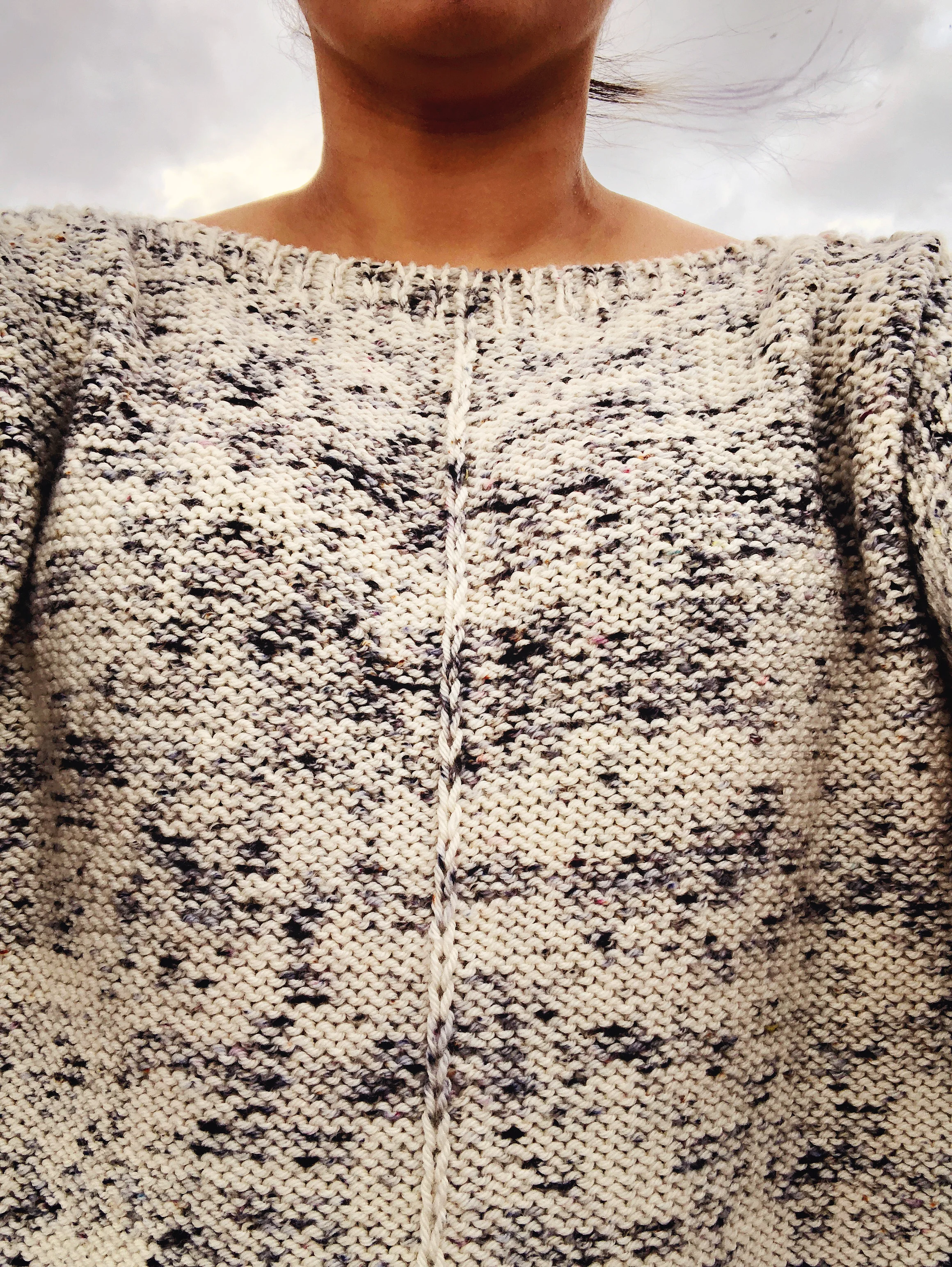 The only modifications that I made to this pattern was to shorten the length by about an 1”. Initially I alternated skeins of yarn every 2 rows or to try and avoid pooling of of the black and grey tones of the yarn bit i was getting some tension issues carrying the yarn on the inside of the sweater since this sweater is knit in the round in reverse stockinette stitch. I eventually transitioned into just knitting one skein at a time and while there is some pooling I think it adds to the way the sweater looks so I’m not fussed by it. It actually looks kind of intentional as the majority of the pooling occurs near the top of the sweater giving a s sort of gradient effect. :)