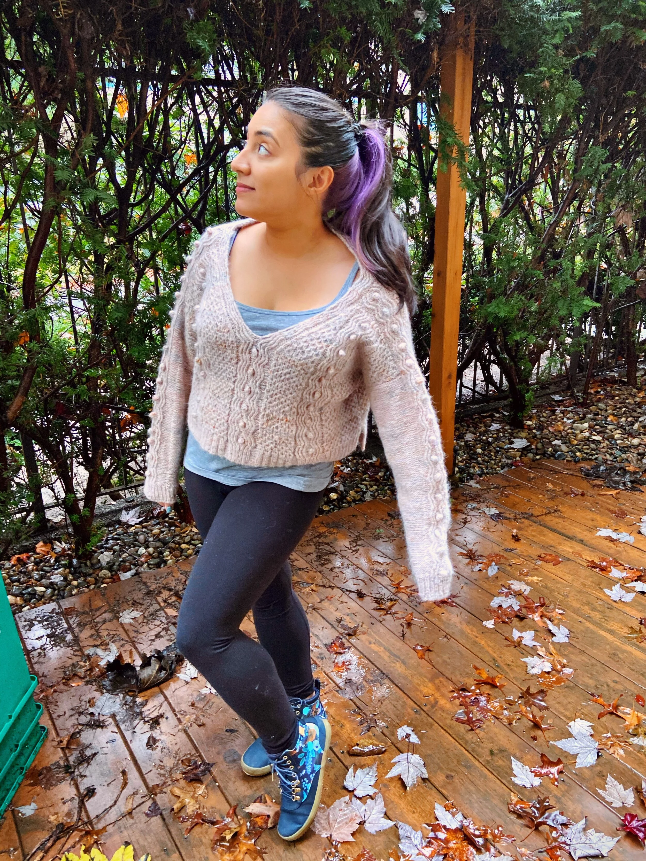 I think one of the hardest parts about knitting a cropped sweater like this is to find ways to style it, in the images of me wearing the sweater I am styling it super casually with a RTW tank top and leggings. Thanks to my lucky win of a dress form at this year’s Vancouver Frocktails I can actually try out the sweater with a few different shirt options! In the gallery above I’ve styled it 3 ways, first with a long sleeved plantain tee that I recently made (I actually wore this combo to work recently and it was so nice and cozy in my cold corner of the office!), the second is with a simple woven tank pattern called Clark from Seamwork Magazine, for the third it’s paired with one of my favourite matcha tops and I really like how the collar of the matcha pairs with the wide neckline of the sweater! (the last photo is another close up of the bobbles because I love them!). It was really fun to play with the styling by playing dress up with my dress form, it was an easy way to try out some new ideas without getting caught up in looking at what my body looks like vs what the styling looks like.