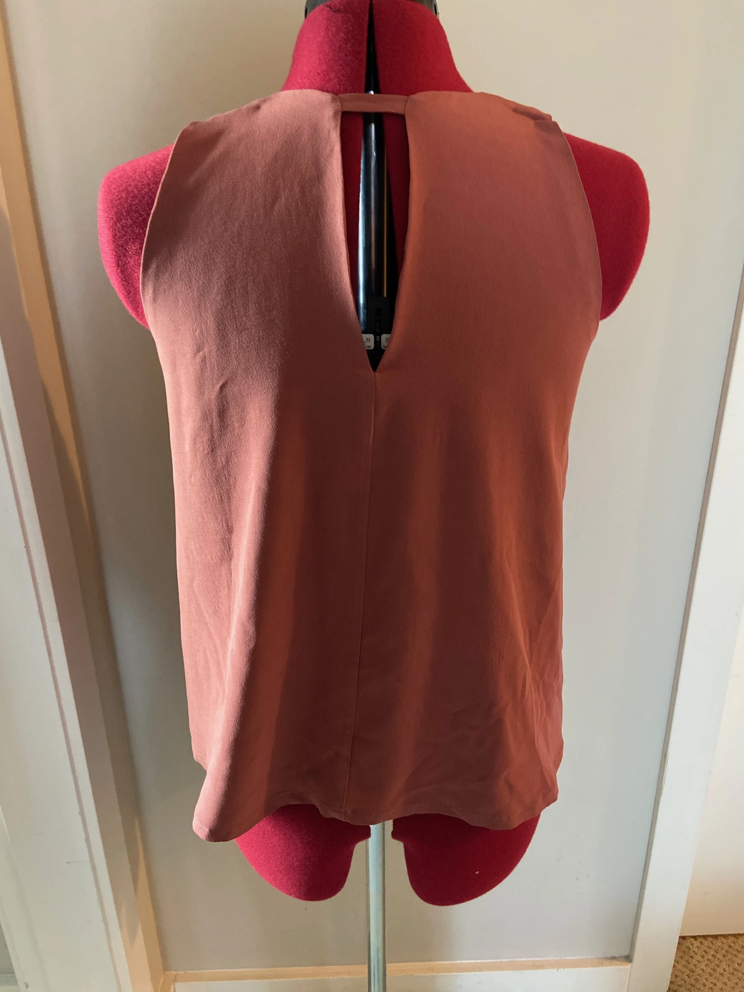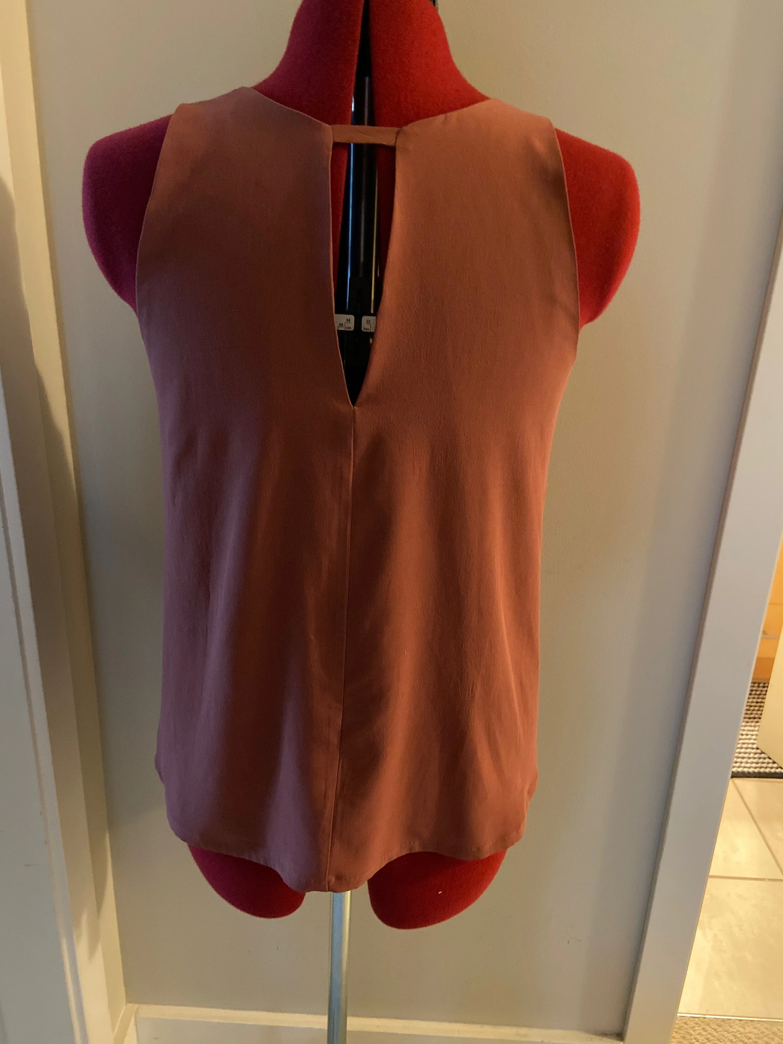 I was really excited to try the top on once I was finished, I had it stored on my dress form for a day or two before getting around to trying it on and was initially disappointed to find that the arm holes were too low and my bra was very visible, the side seam also was at an angle indicating that I had some extra length somewhere. to see if the strap length was the issue I pinned up the straps at the shoulder seam taking length from both the back and front of the top. This made a huge difference in fit, not only did my bra barely show anymore but the side seam hung straight. In the pictures below you can see the unaltered top on the dress form on the left and the altered one on the right, the front of the top has been raised and while it’s hard to see on any difference in the arm hole length trust me it’s there lol