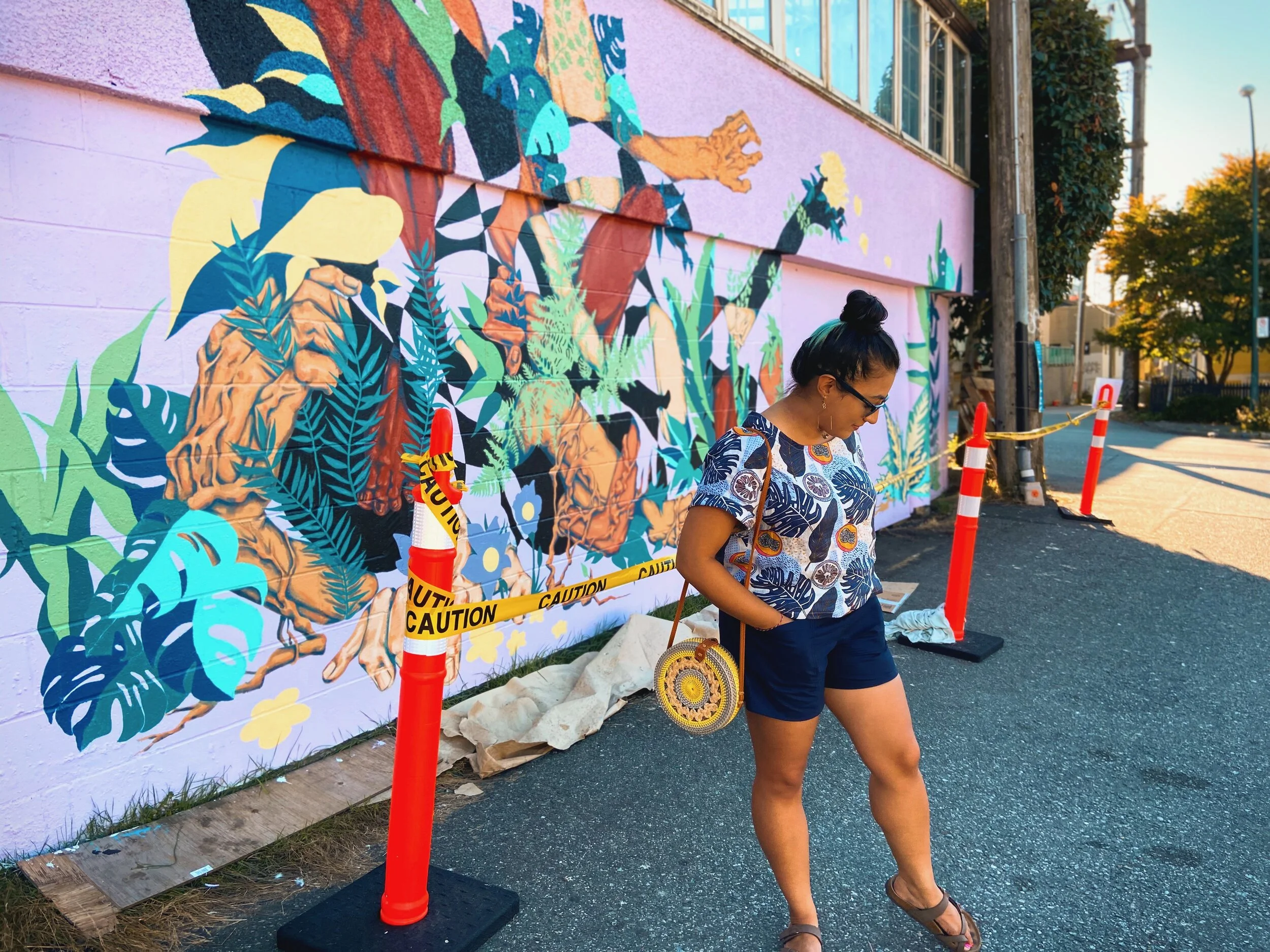 Today I’m sharing another summery make despite it being September already! (Does anyone else feel like this year has simultaneously lasted around 5 years but also feels like we’re only a few months into the year at the same time?) Summer looks like it’s going to stick around for a little longer here in Vancouver, so I took the opportunity to sew up some more super breathable linen projects! I’ve been really loving the linen this summer, we don’t have AC at home so it’s really nice to wear something so breathable while working and while socially distancing around the city, which is how these pictures were taken! Since 2016 Vancouver has hosted a yearly mural fest featuring both local and international artists! I highly recommend checking out the murals (there’s a handy app with a map and info on each one) if you happen to live in Vancouver or plan on visiting (post-pandemic obviously) I would highly recommend taking yourself on a self guided mural walking tour like we did! I’ve noted the artists for each mural in the pictures in the caption of the first image featuring that mural if you want to check out some of these artists further!