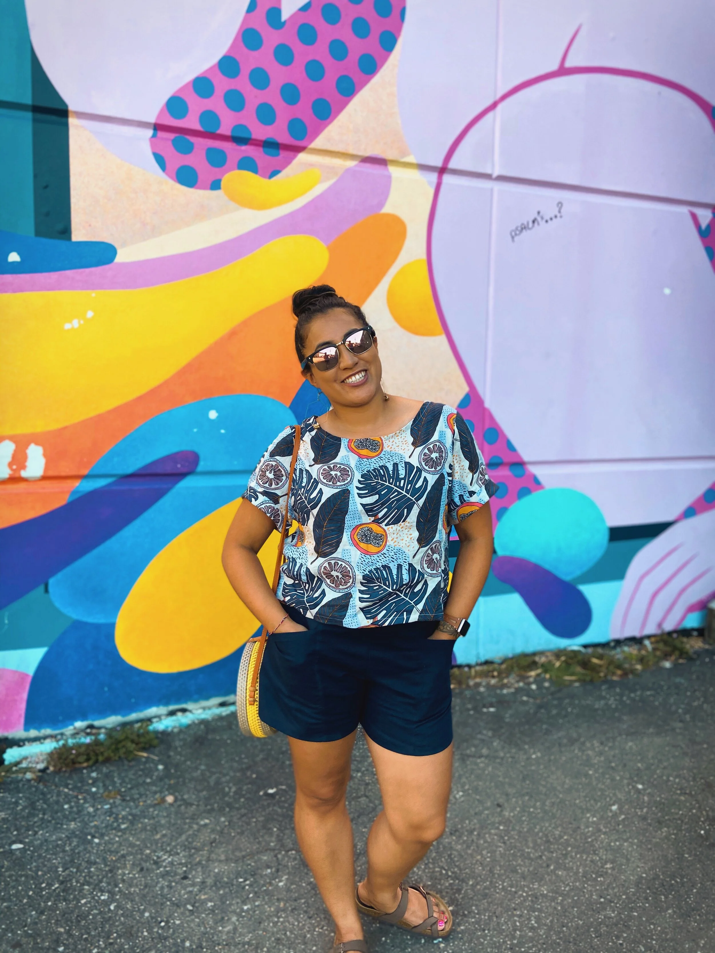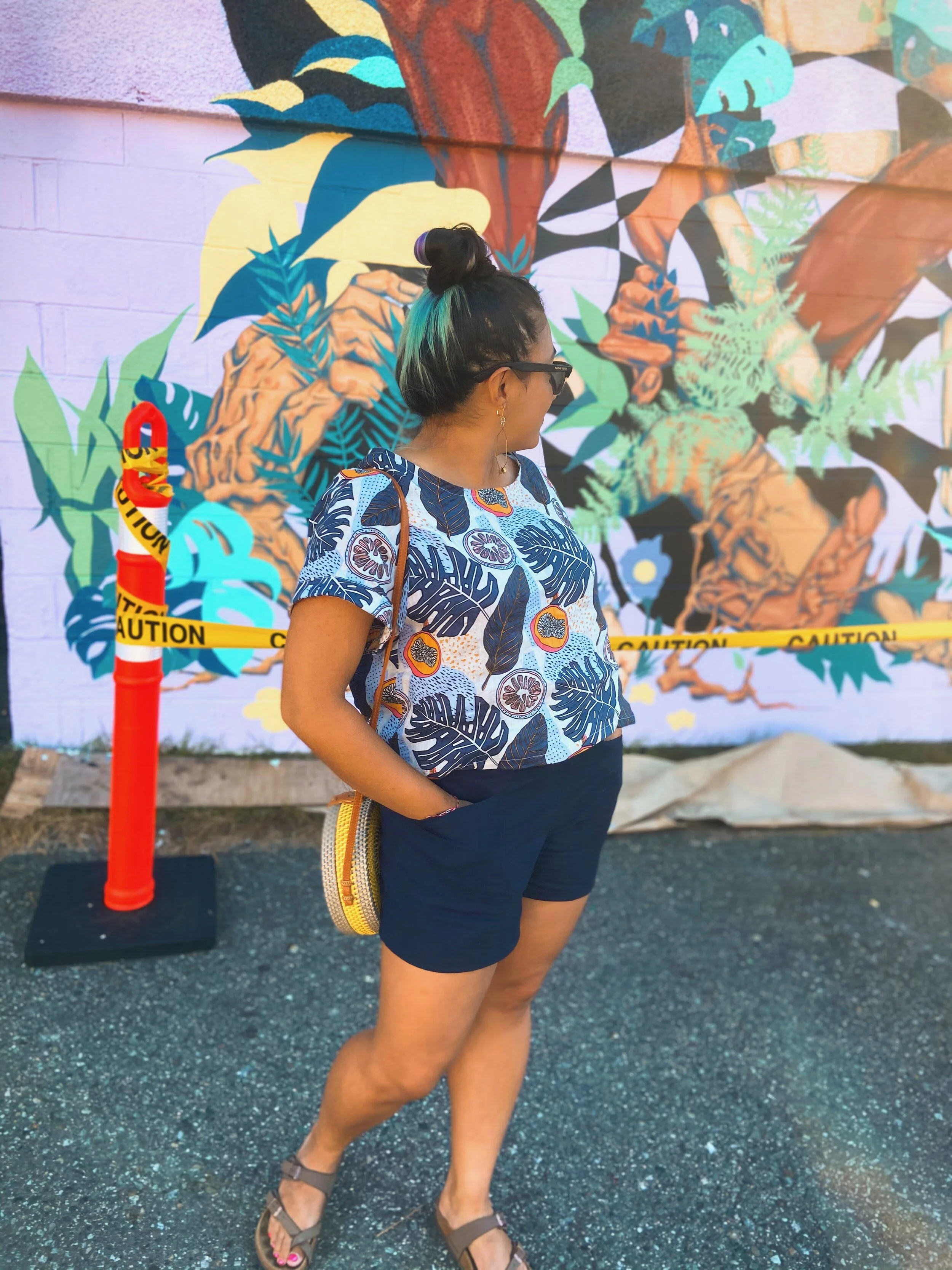For this top I used this amazing tropical print from Blackbird Fabrics, I had originally intended this to be a dress and even had a pattern picking instagram poll (the Charlie caftan won!) but then realized that I didn’t have enough fabric for a dress, but did have enough to make two tops! (I also made another Hanna tank top, un-blogged as of yet, but you can see my first one in this post!) For this version of the Cielo Top I cut a straight size 10 in the A/B cup with the only modification being to the length. I had found that the original cropped length was a bit too short for my liking when I made that first version earlier in the year and lengthened it by about an 1 inch or so to get this version. Like I previously mentioned, this pattern comes together in a snap! I think I sewed it over the course of an evening or two, making it a great patten to reach for when you need a quick sewing pick me up! The only think I think I would have changed if I could would have been to use the dark navy linen that I used for the shorts for the sleeve cuffs to add a bit of contrast.