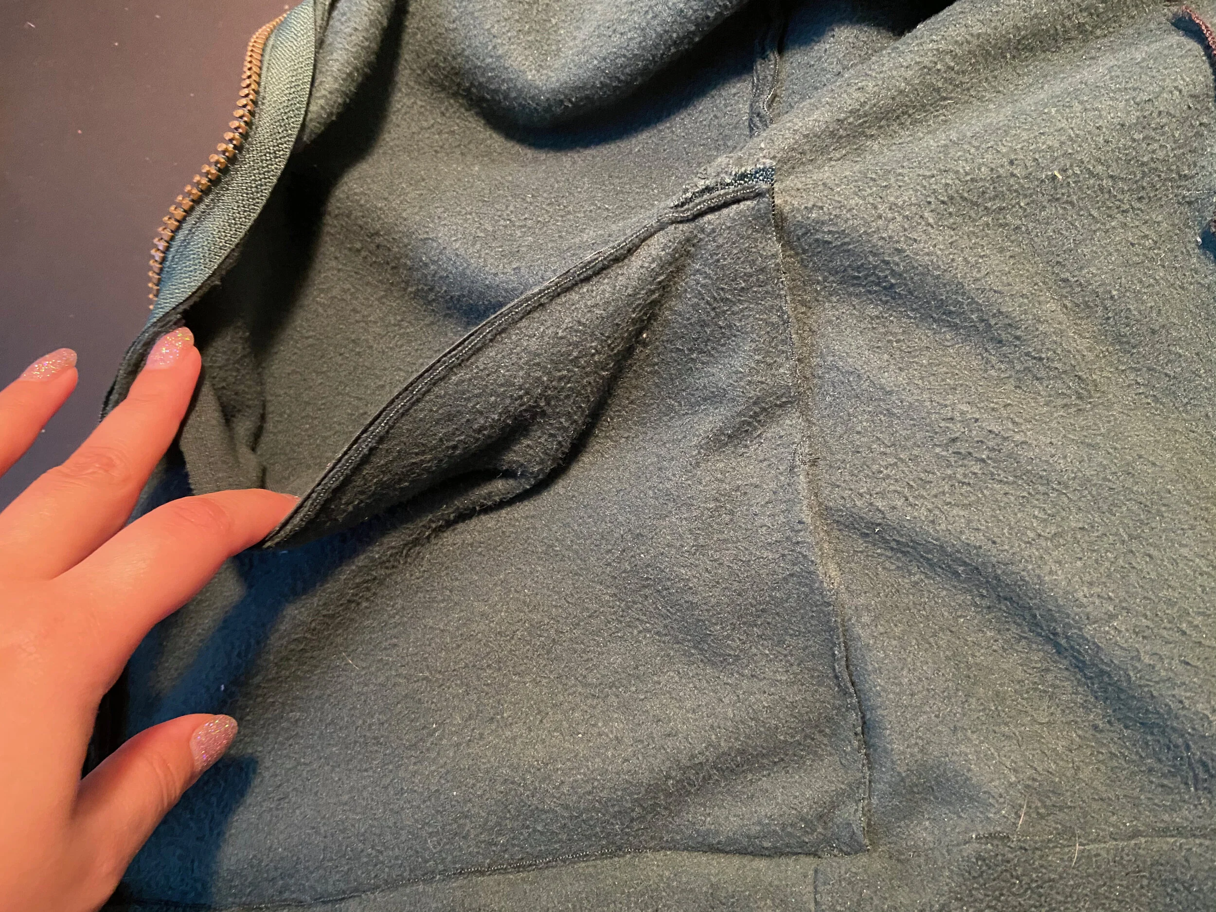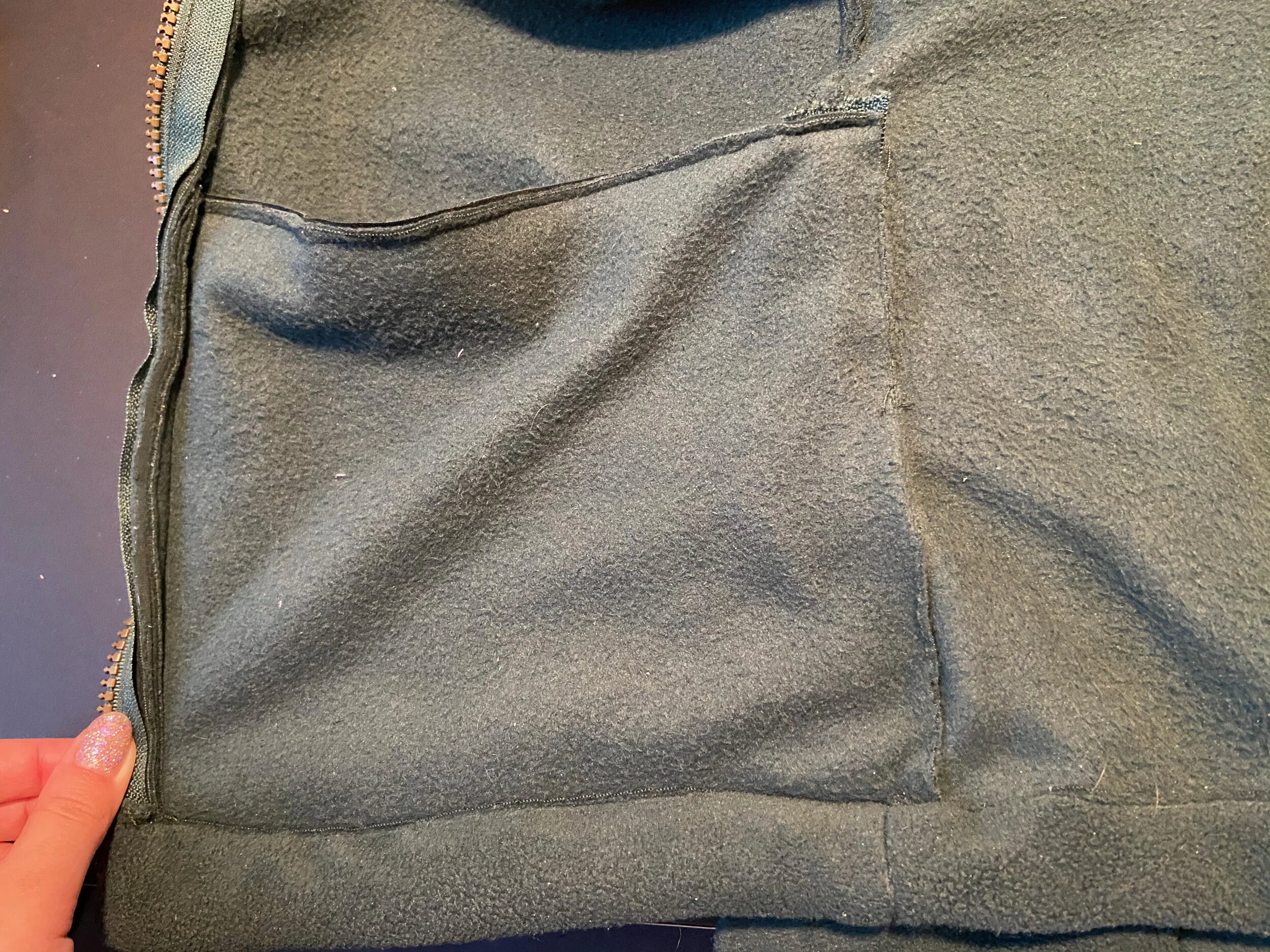 For his version the FluffyBlondeMonster had a few requests/modifications…he decided that he didn’t want any colour blocking as his old fleece does have some (it’s black and an olive green) and that he didn’t want the chest pocket. He also requested that the zippers on the pockets be changed from invisible zips to regular zipper pockets (which I totally agree with, I think if I had done an invisible zip with this fleece it would have just been so fiddly to get the pocket open since the teeth on the invisible zips I have ready access to are very small. He also requested that I modify the pockets so that they function as an internal pocket as well, a feature he really loves about his older fleece. To accomplish this I omitted the pocket piece from the pattern and made two new rectangular pieces that went from the zipper opening of the pocket to the center front zipper. The shorter of these pieces I attachted to the zipper seam allowance closest to the center front and the other to the farther seam allowance to make a sort of pocket bag, I then attached the two pieces at the top to make a partially enclosed pocket bag. To reduce bulk I used a matching jersy fabric that I had kept (hording tendencies for the win!) and used the eventual hem of the jacket to close the bottom of the pokect by tucking the pocket bag into to it prior to hemming. To add structure to the pocket bag I attached the remaining end of the pocket bag to the center front seam which will keep the pocket bag in place while transfering some of the weight of whatever is in the pocket to the center front seam. I forgot to take pictures as I went but I hope the picture below helps explain what I mean :)