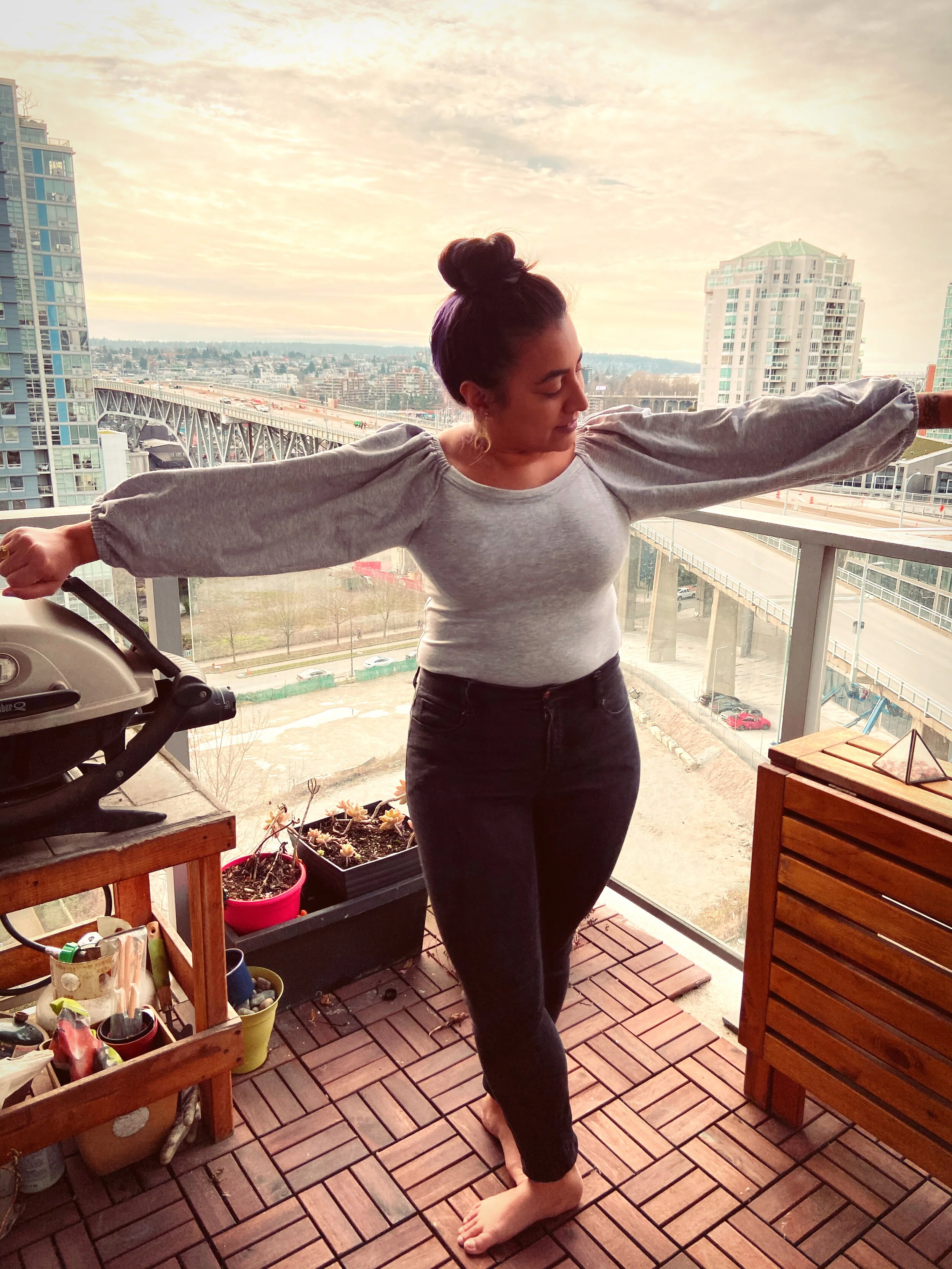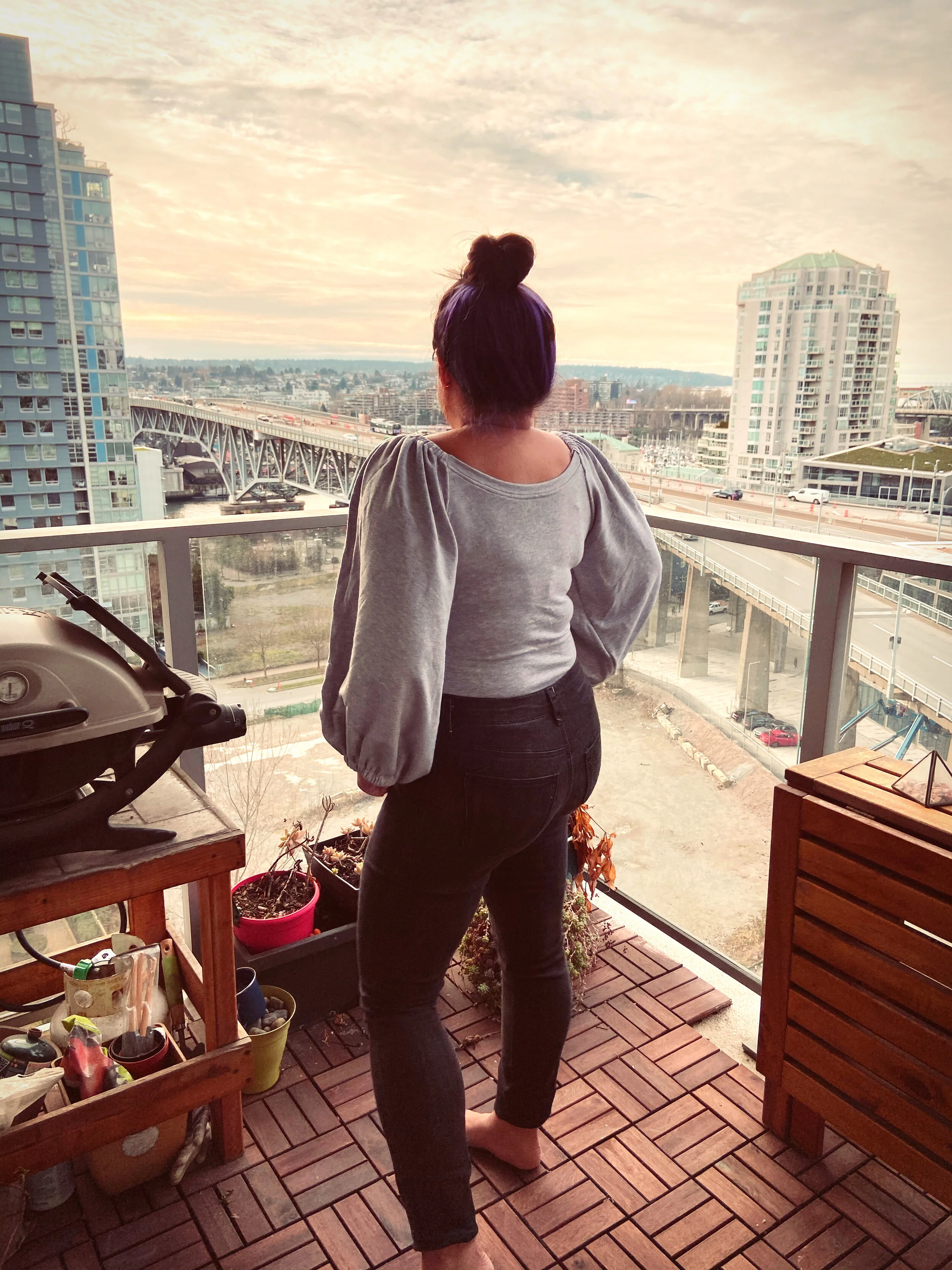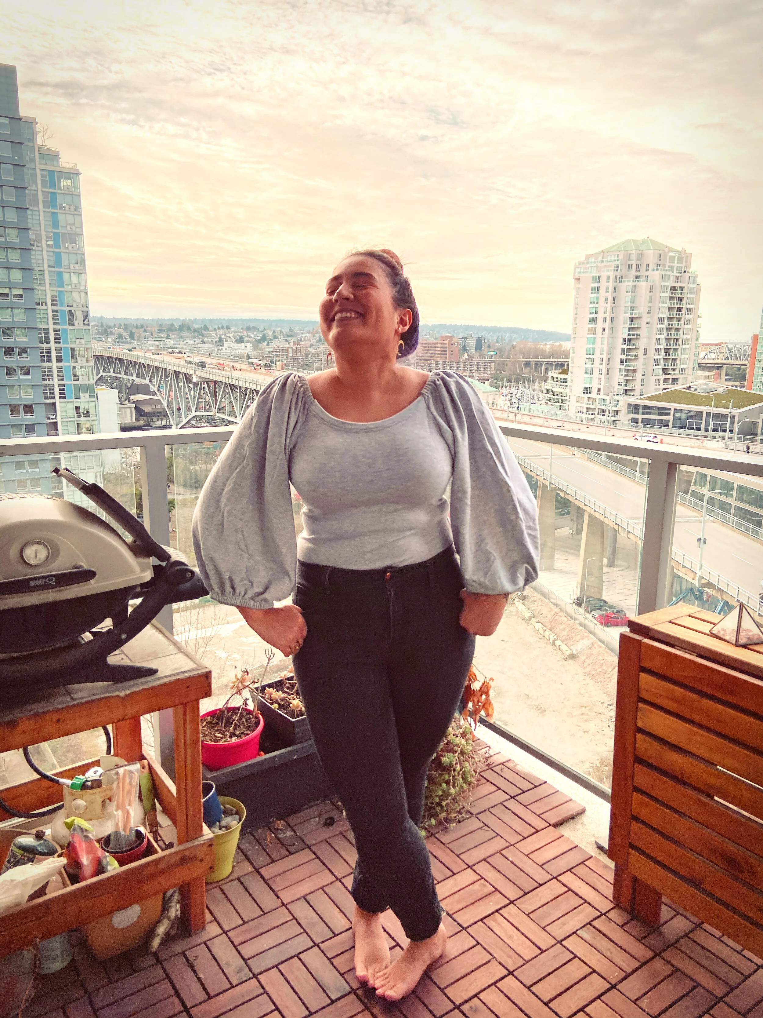 I’m really glad I chose a bit of a thicker knit fabric with this grey french terry, the snug fit of the body of the blouse means that any seams from undergarments will show through if the knit isn’t thick enough. I have to admit that I was pretty self conscious about wearing this top for the first time since I’ve been feeling a bit ‘out of shape’ over the last few months. BUT I absolutely love the sleeves on this blouse (I’m feeling dramatic sleeves lately) so I’m hoping that the fun sleeves will convince me to wear this blouse more despite any self conscious reservations. The fluffyblondemonster was making me laugh as we took these photos to help me get over my self consciousness. If you have any tips for getting over your internal critic when you’re wearing your me mades let me know in the comments!