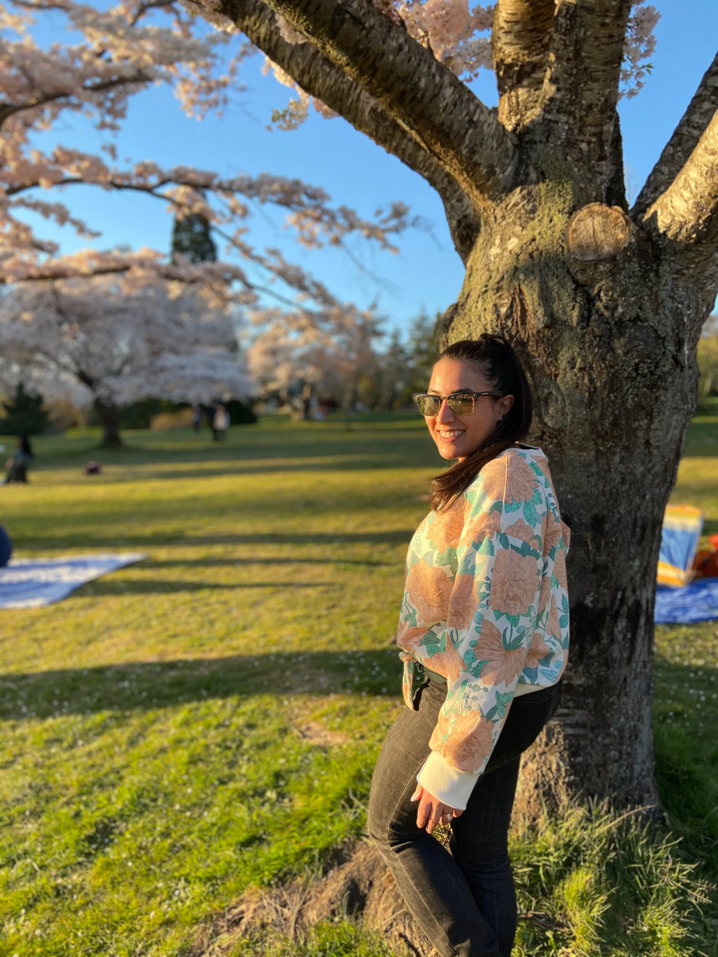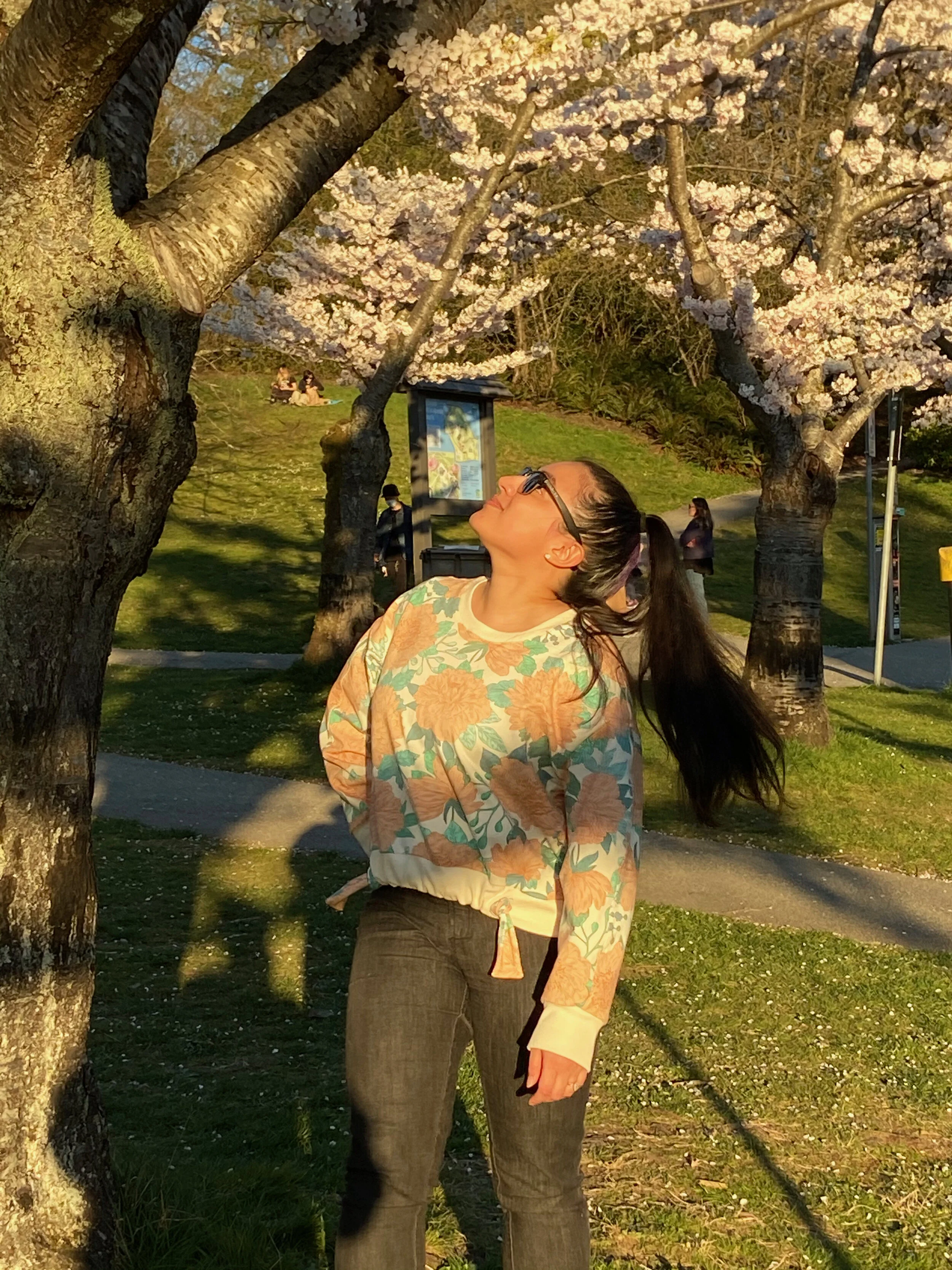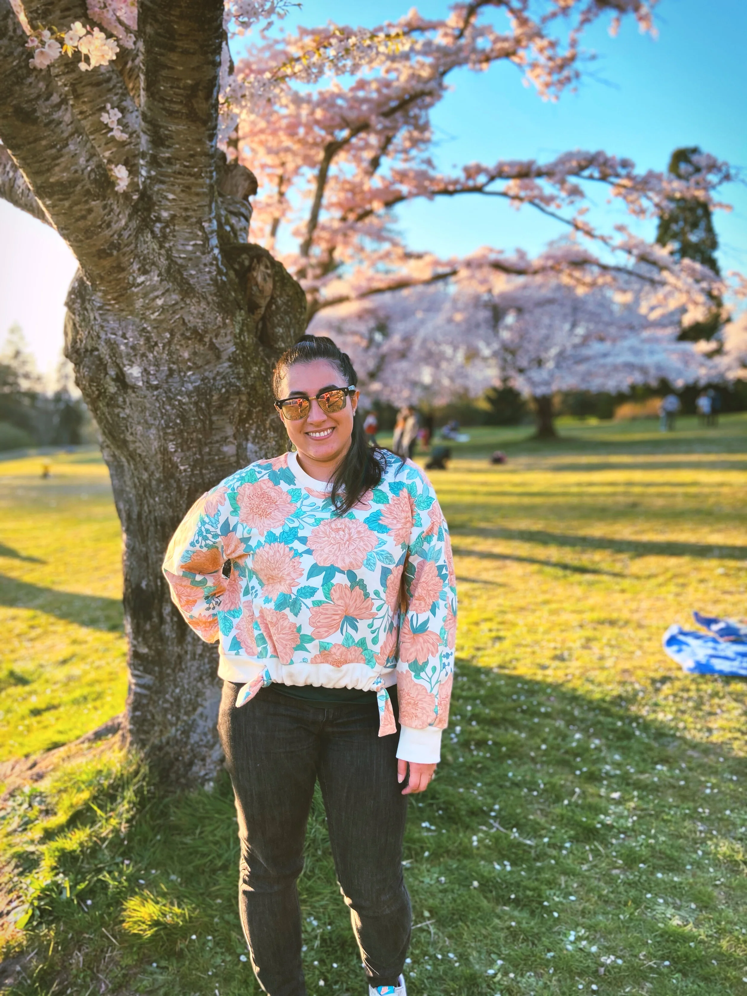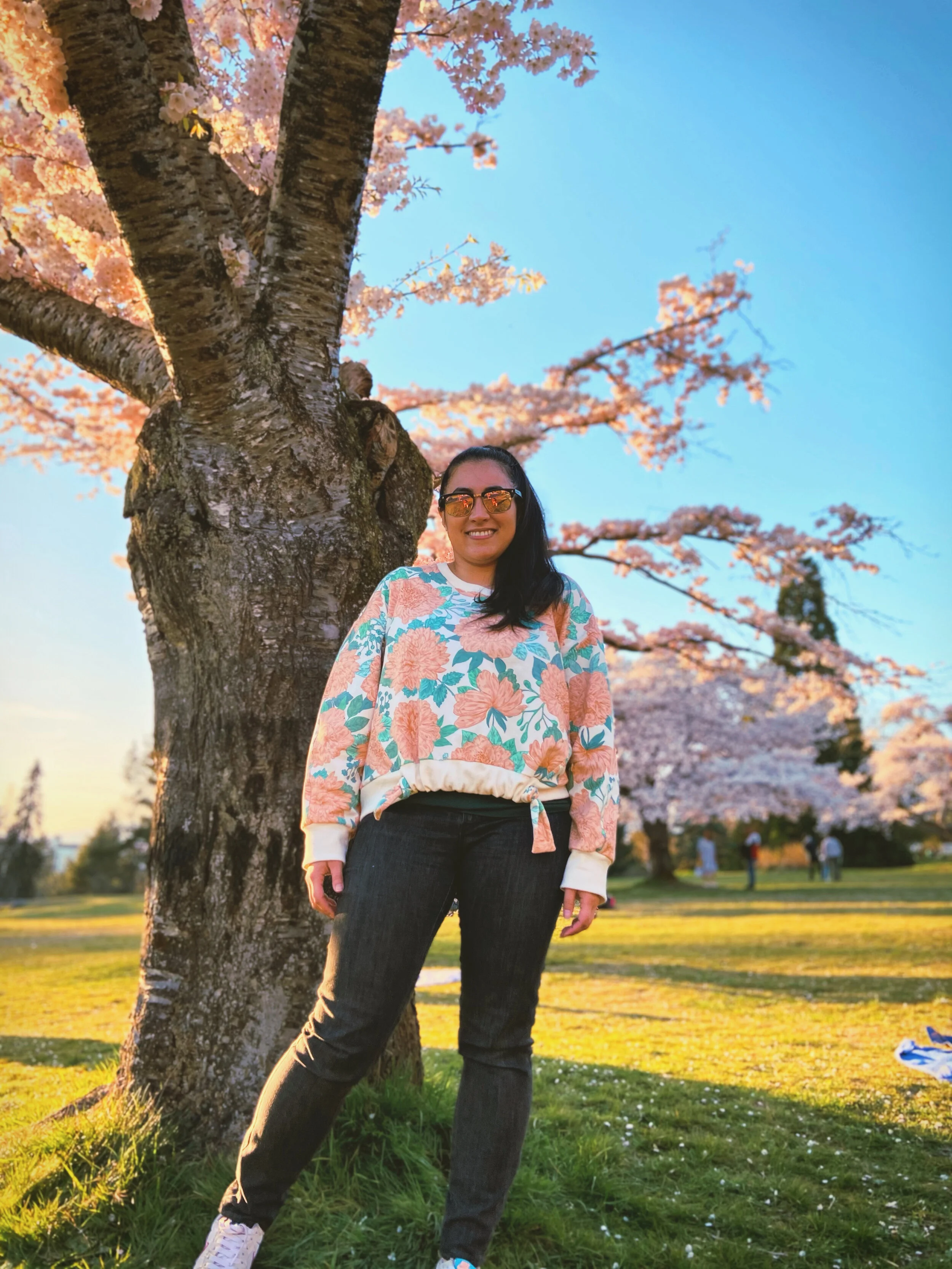 For the fabric I chose this peony filled, organic cotton french terry by See You At Six that I got from with June and Lu Fabrics on Etsy with matching off-white ribbing. I LOVE this print, it just screams spring and I’ve been loving wearing it around while enjoying all of the lovely spring blossoms that Vancouver has to offer. So much spring so little time to enjoy it all! Especially the cherry blossoms which last just long enough to enjoy them for a bit before they disappear for another year.