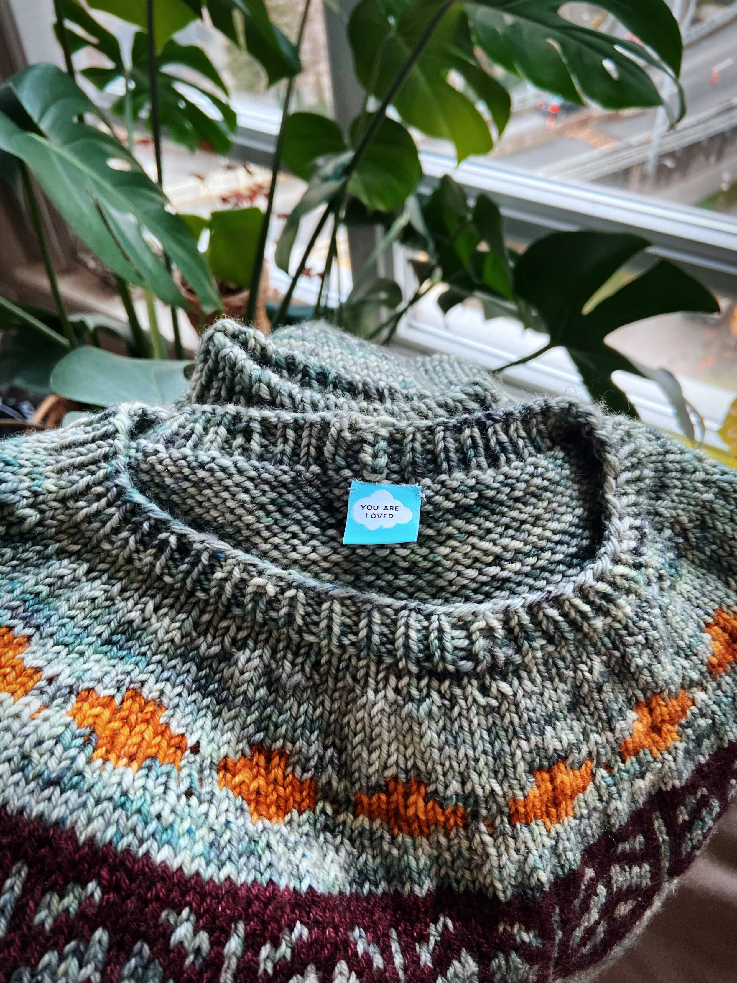 In terms of modifications to the pattern the only one I made was to shorten the sleeve length by 1/2” to keep a sort of bracelet length. I also added this lovely tag from Kylie and the Machine to the back of the sweater to help distinguish the back from the front (the back neck short row shaping really helps create a nice neckline and fit for this pattern but it can be hard to distinguish which side is the back when you are just holding up the sweater). I really love the way this sweater fits, it’s oversized while maintaining a really flattering silhouette and I actually really like the oversized yoke and how it extends the colourwork over a wider space. I will say thought it can be tricky to reach up for things as then the whole sweater rises up so definitely wear this with a pair of higher waisted jeans like these skin tight midrise ginger jeans that I’m wearing here.